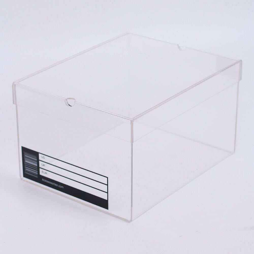 A clean transparent display box designed to replicate the boxes of your favourite brands. Offering further protection and a way to show off your most treasured kicks, this is an excellent way to store the valuable elements of your collection. Finished with a size and style code sticker for an authentic feel.